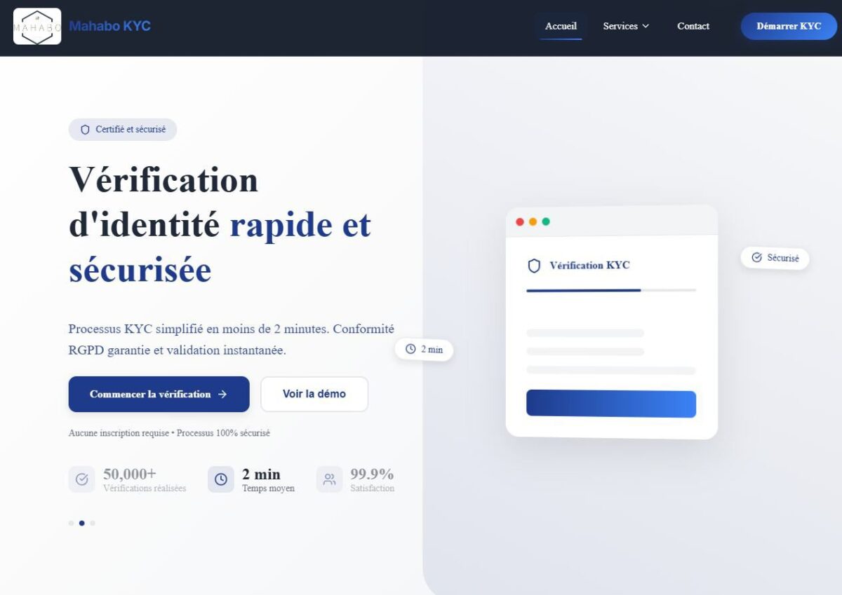 Interface sécurisée de vérification d’identité (KYC) pour les utilisateurs de Mahabo. Authentification, gestion des documents, et tableaux de bord administrateur.